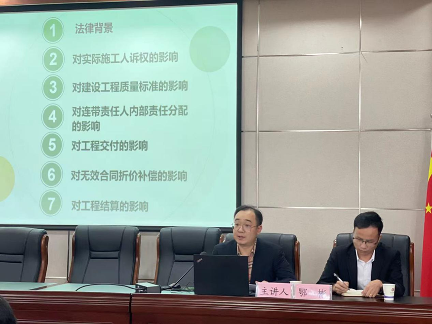活動邀請湖北易圣律師事務(wù)所鄂彬律師擔(dān)任主講,鄂律師從《民法典》對施工人員訴求、工程質(zhì)量標(biāo)準(zhǔn)、內(nèi)部責(zé)任分配、工程交付、合同折價補(bǔ)償、工程結(jié)算等六大影響作了深入淺出、生動細(xì)致的講解,具有很強(qiáng)的針對性和實用性,使參加培訓(xùn)的人員收獲頗深。