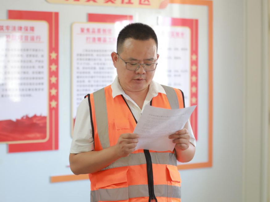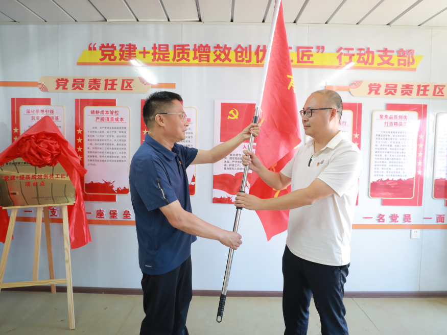隨后,建工集團機關黨支部開展“能工巧匠”黨建品牌活動,學習宣貫了清廉項目清風工匠行動、青年突擊攻堅工匠行動和提質增效創(chuàng)優(yōu)工匠行動實施方案。王鵬同志帶領全體黨員宣讀了廉潔從業(yè)誓詞,崔巍同志和呂成芳同志分別為項目廉潔監(jiān)督員頒發(fā)聘書,廉潔監(jiān)督員代表作了履職承諾。建工集團機關支部舉行了“建工集團青年先鋒突擊隊”授旗儀式,洪登峰同志將隊旗授予青年先鋒突擊隊隊長。最后全體黨員按照黨員責任區(qū)分工檢查了項目安全、進度、質量、經(jīng)營、物資管理、法律風險的情況,并與項目部深入交流,提出改進措施和意見。